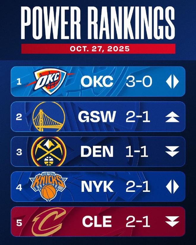 新赛季第一周打完,实力榜也是进行了更新,排名也发生了很多变化。这当中卫冕冠军依然高居第一的位置,勇士则冲到第二,掘金来到第三,尼克斯依然排在第四,接下来则是骑士、湖人、森林狼、马刺、快船和活塞。前10当中西部球队占据7个,新赛季西部的竞争将会变得更加激烈。